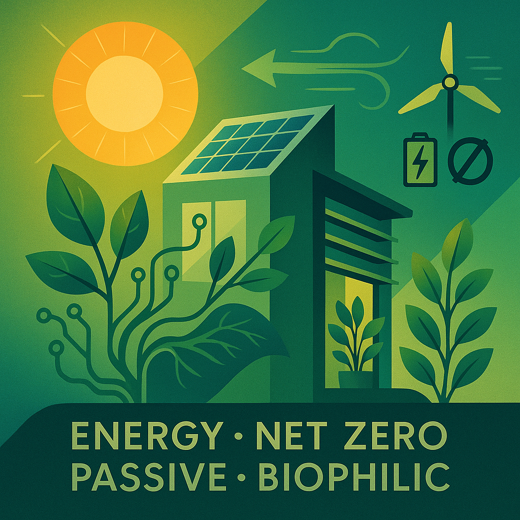 Energy-efficiency, net zero, passive design, biophilic design.